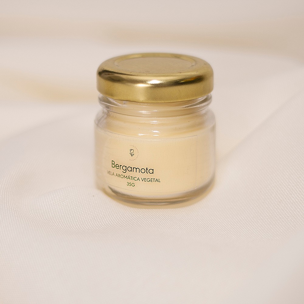 Mini vela aromática feita com blend de cera vegetal de côco, arroz e palma, essência premium aroma Bergamota (Tangerina), pavio de algodão. Pote de vidro com tampa metálica.